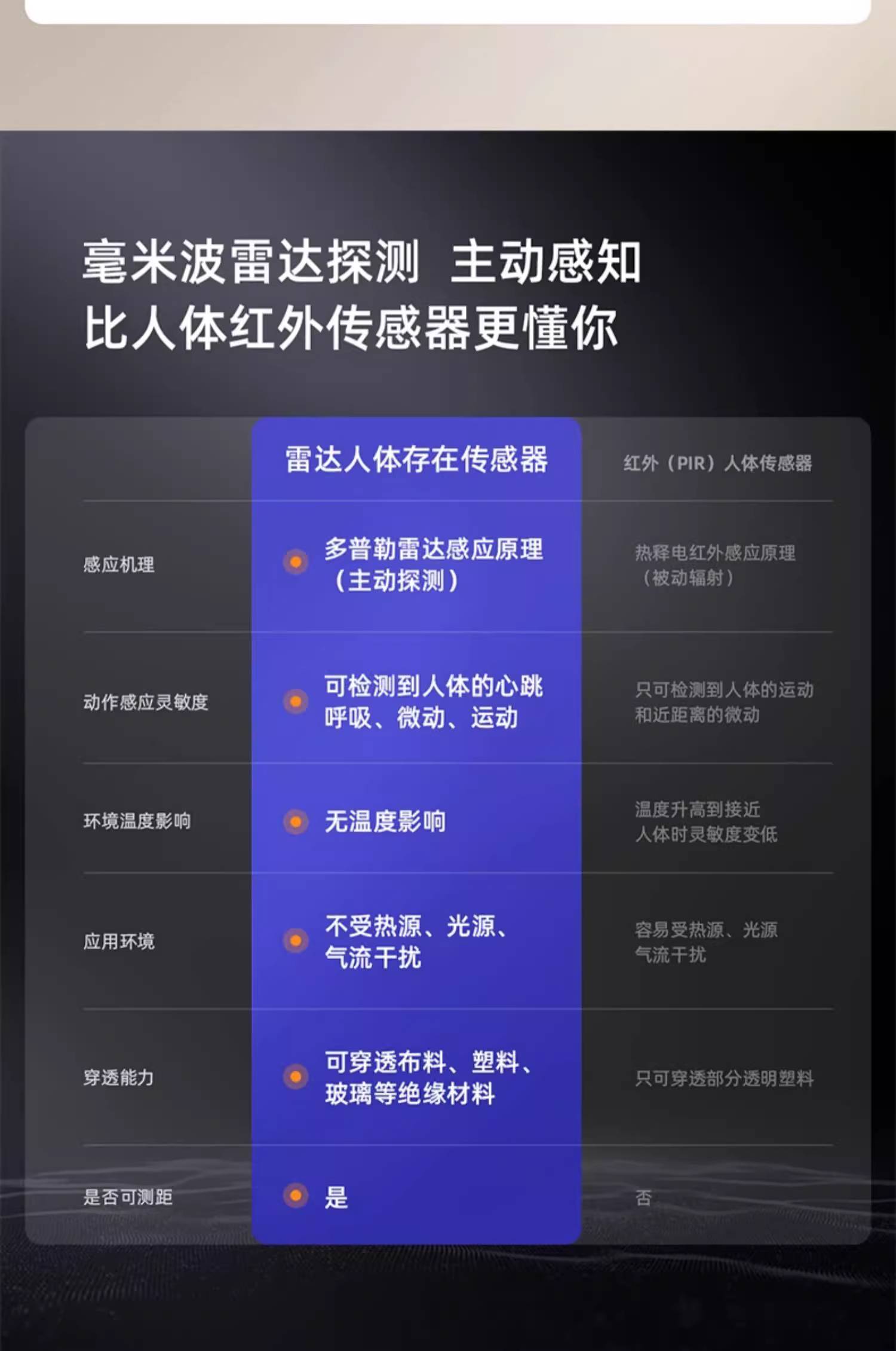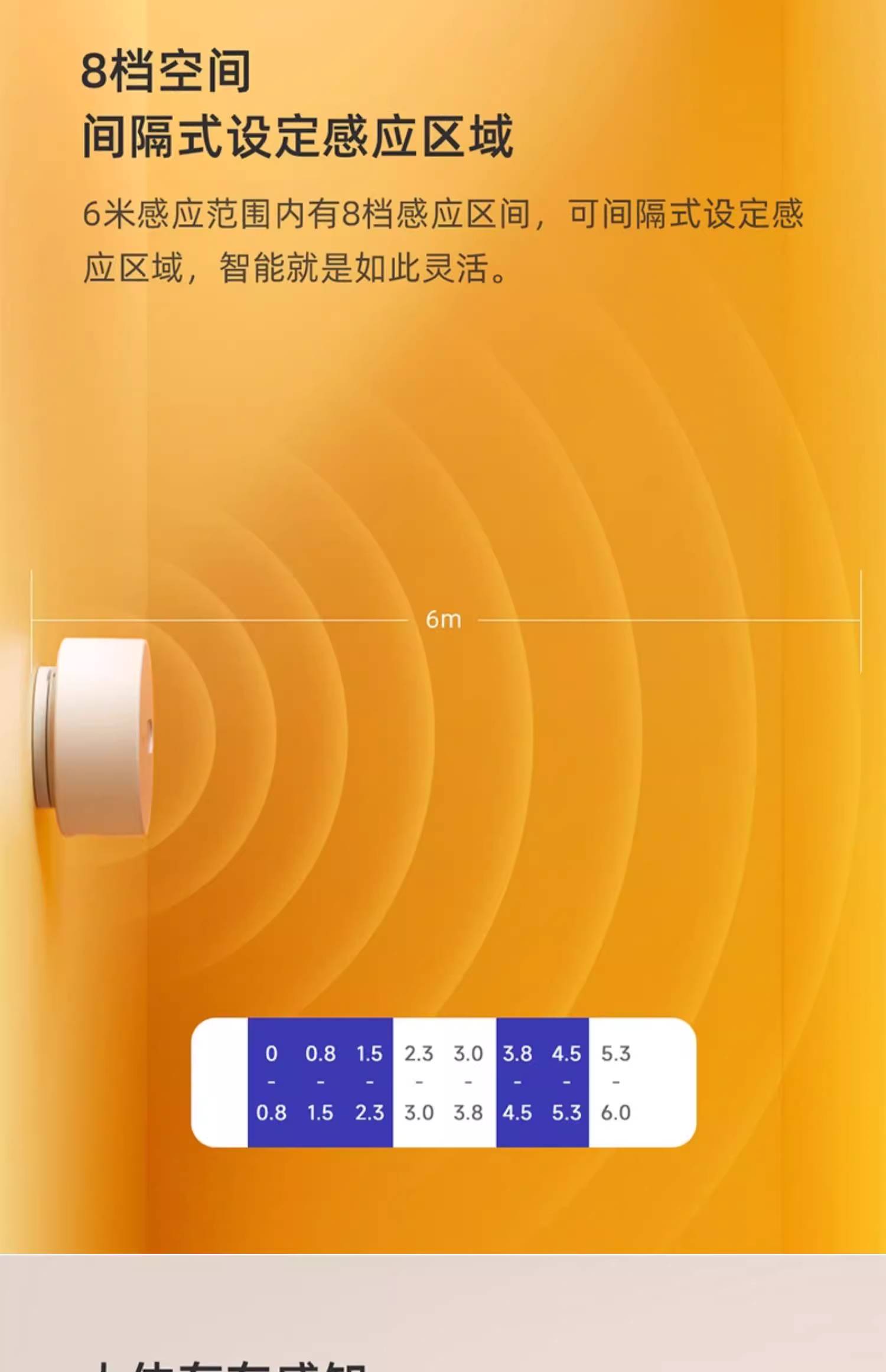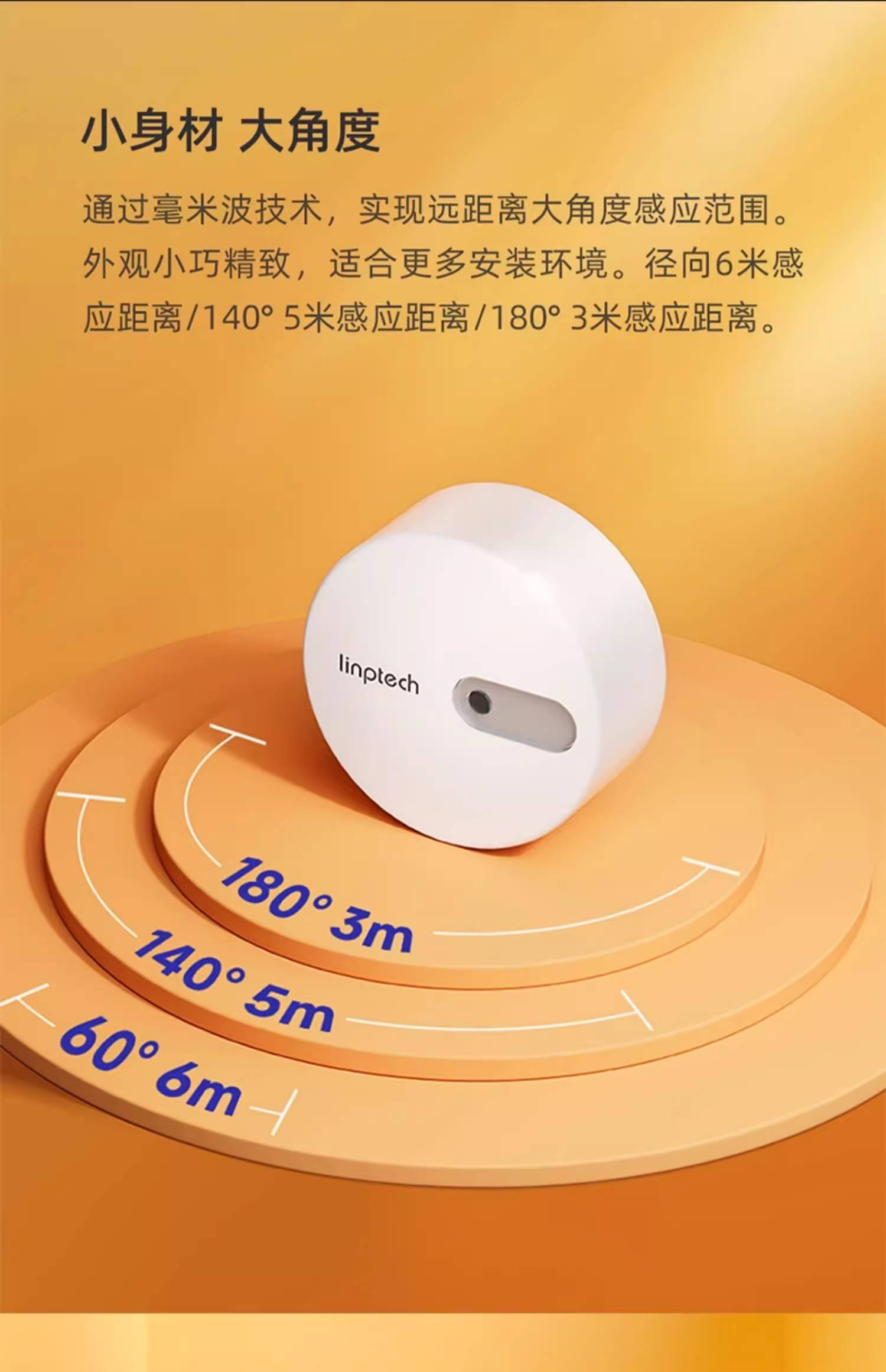 6米感应距离 8档间隔式可调 最大180°感应角度 无人判断时间秒级步进 接近远离感应