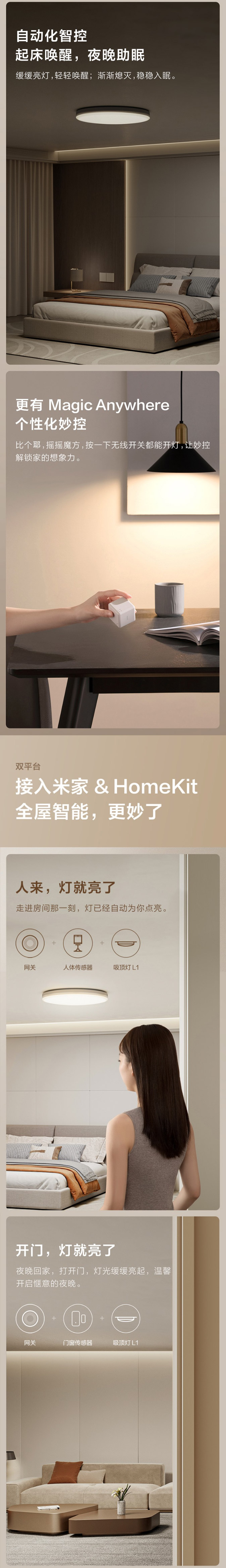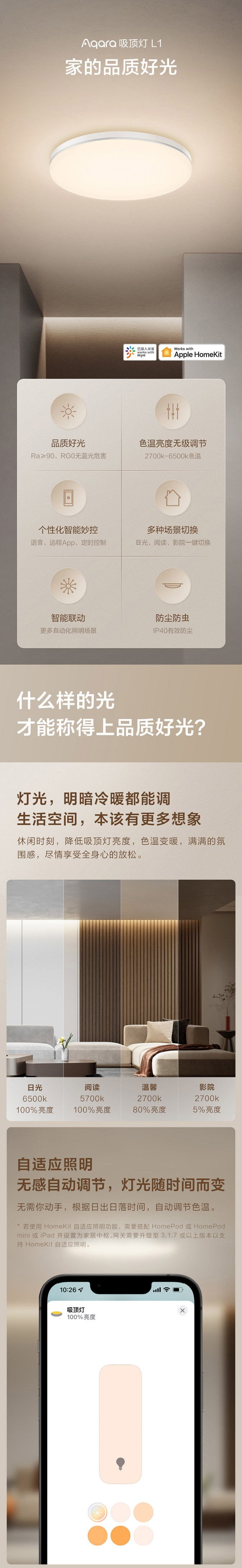 Ra90高显色 Rg0无蓝光危害 色温亮度无极调节 个性化智能秒空 多种场景切换 防尘防虫