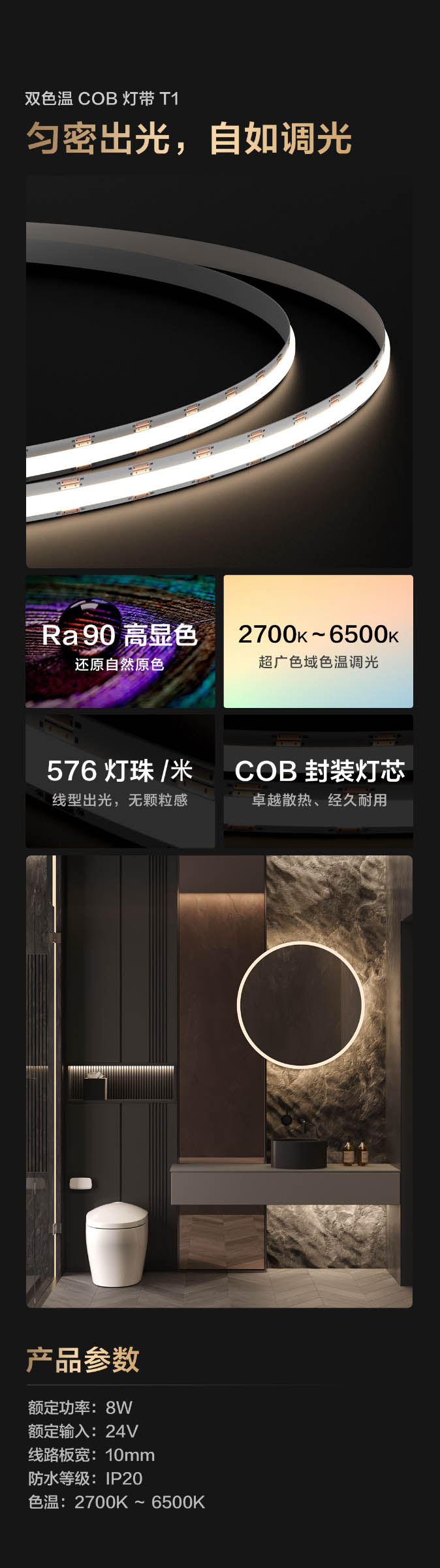 Ra90高显色 超广色域色温调光 576灯珠/米 COB封装灯芯