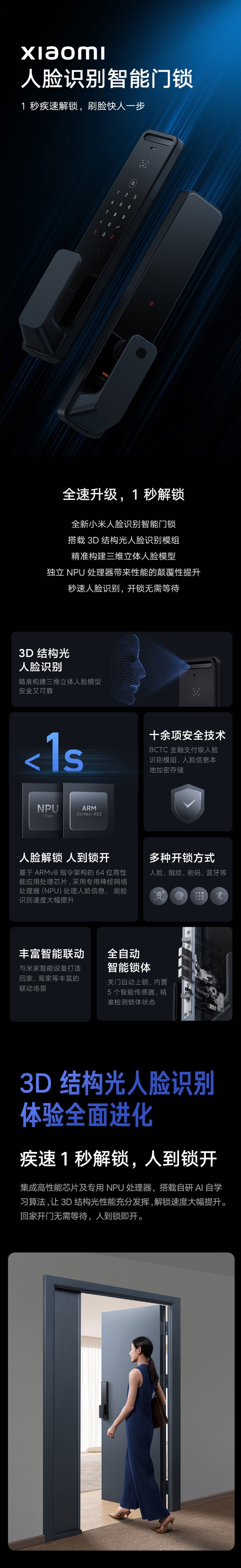 1秒极速解锁,白天黑夜,识别无忧,关门自动上锁,安全到位。